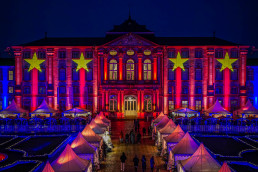 In der Vorweihnachtszeit füllt sich der Ehrenhof von Schloss Bruchsal wieder mit bunt beleuchteten Pagodenzelten. Vor der festlich illuminierten Fassade der fürstbischöflichen Residenz herrscht ein reges Markttreiben: Zwischen Tannenbäumen sind die Gäste zum Stöbern und Entdecken eingeladen: An den Ständen bieten Ausstellerinnen und Aussteller aus der Region selbstgemachte Geschenkideen, Accessoires, Kulinarisches, Deko-Artikel und vieles mehr an. Ein abwechslungsreiches Musik- und Rahmenprogramm sorgt für Unterhaltung.